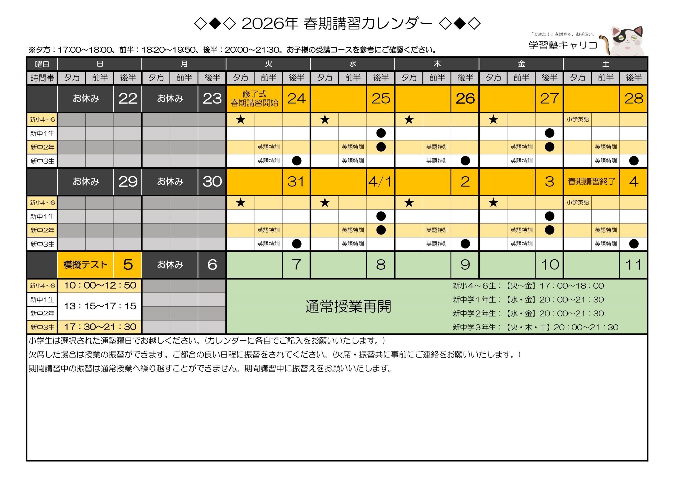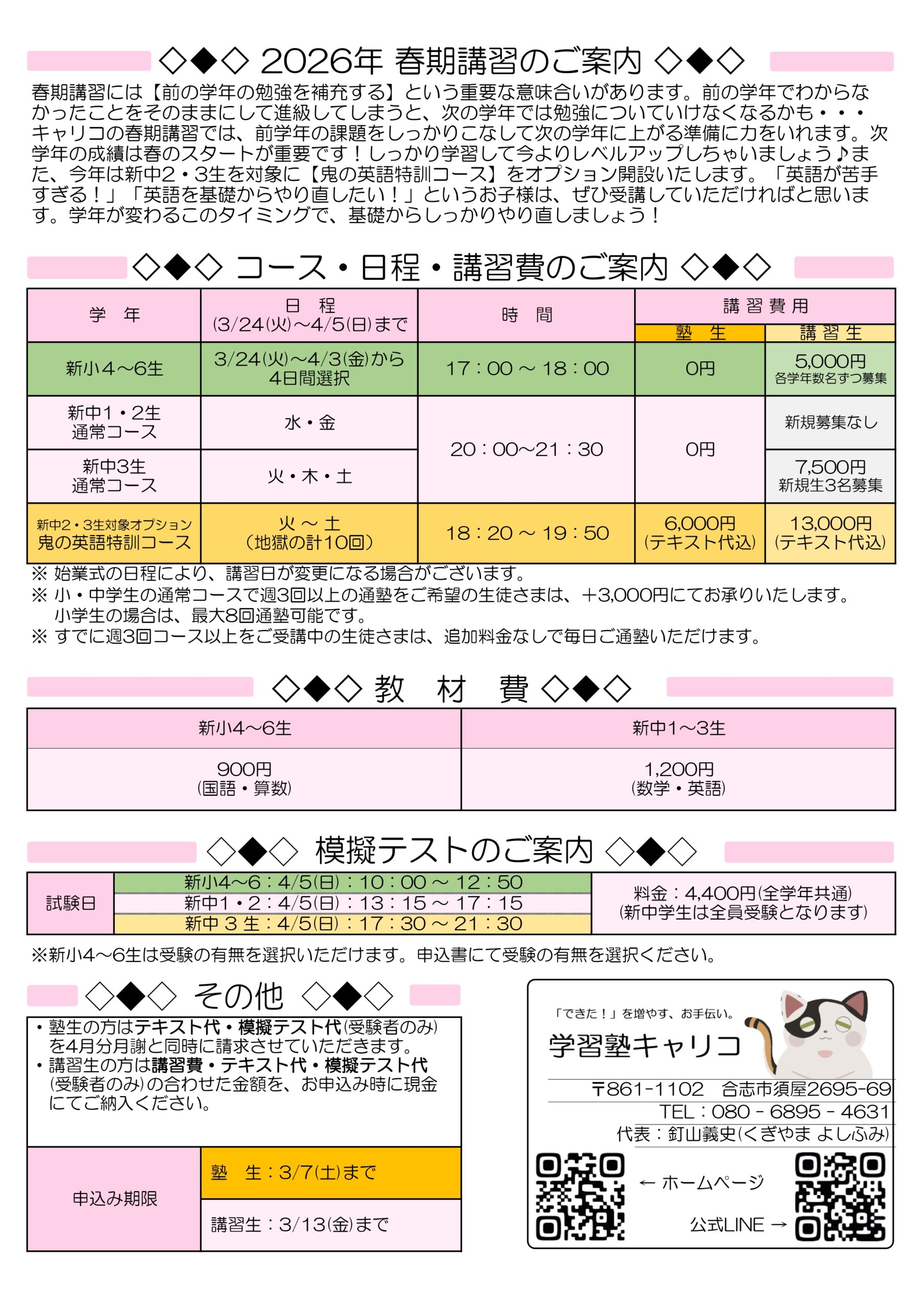 キャリコの春期講習はひとりひとりの課題を見つけ、その子にあった指導を行いますので、苦手を徹底的に克服できますよ♪